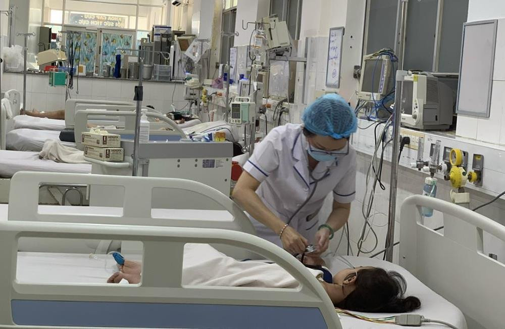 Nhân viên y tế chăm sóc bệnh nhân sốt xuất huyết nặng.