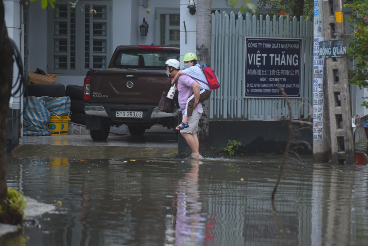 Sáng 26/10, nhiều người dân tại khu dân cư trên đường Huỳnh Tấn Phát, quận 7, TP.HCM phải bì bõm lội nước đưa con đi học, đi làm.
