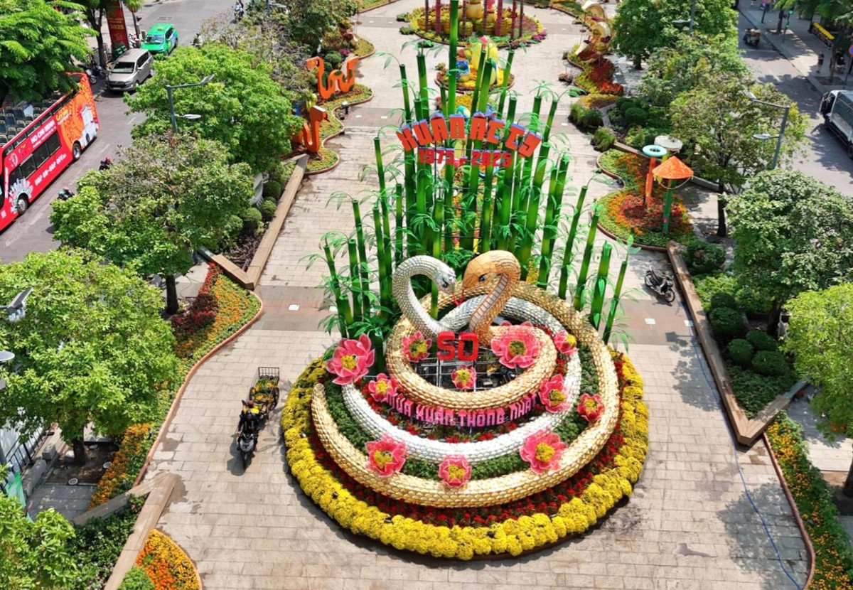 Điểm nhấn của đường hoa Nguyễn Huệ năm nay là linh vật "nàng Tỵ" và cặp "Kim Tỵ, Ngân Tỵ".