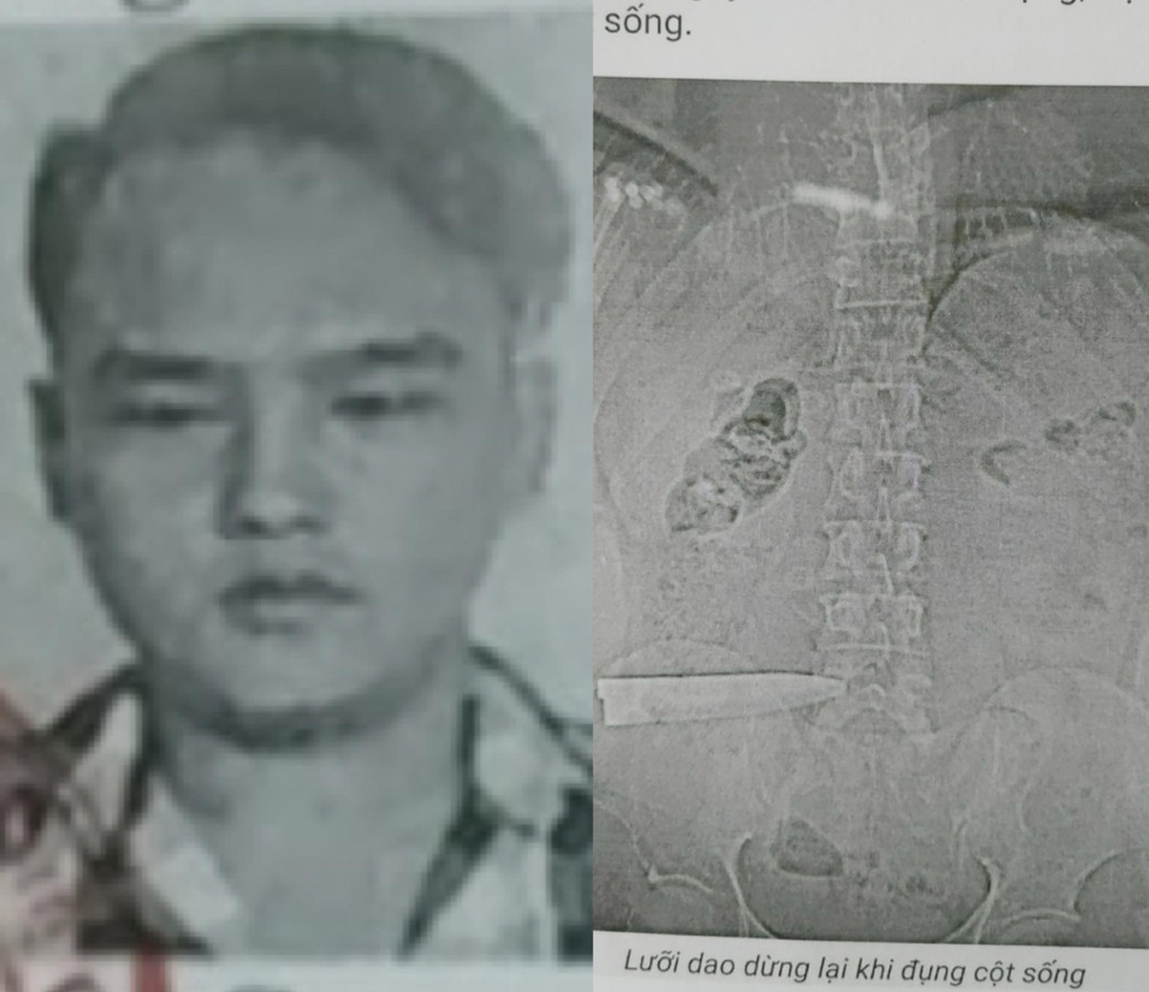 Trần Văn Chiến và hình chụp X-quang lưỡi dao bị gãy trong bụng ông Đ. (Ảnh: Công an cung cấp)
