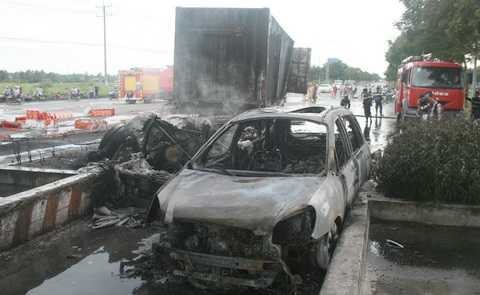 | Xe ô tô và xe đầu kéo bị cháy rụi |