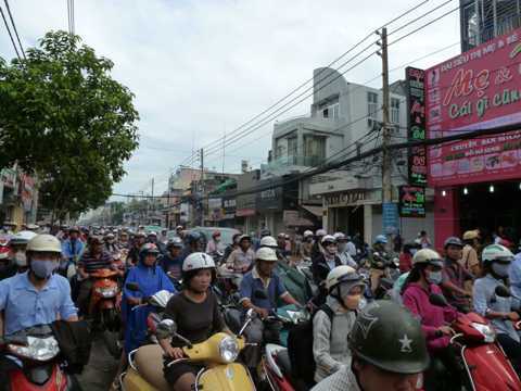 Vụ cháy xảy ra đúng vào giờ cao điểm khiến giao thông trên tuyến đường Cách Mạng Tháng 8 kẹt cứng, nhiều phương tiện phải vã mồ hôi di chuyển từng bước trên đường.