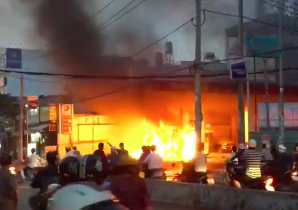 Nhân viên sau đó đã dùng bình chữa cháy dập lửa nhưng bất thành, ngọn lửa lan nhanh và bùng phát mạnh bao trùm cây xăng. Nhiều ô tô, xe máy đậu cạnh các tụ xăng nhấn ga tháo chạy.