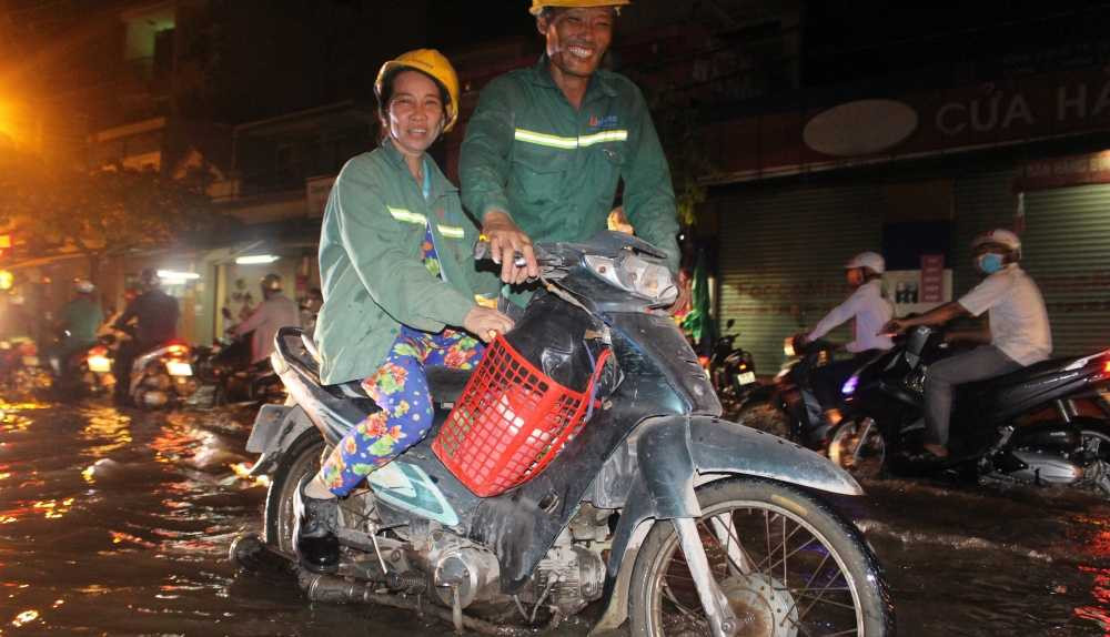 Chồng đẩy vợ trên xe tình tứ trong dòng nước ngập sâu ở Sài Gòn