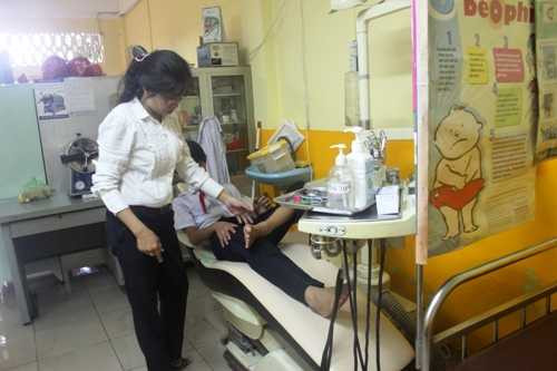 | Nhân viên y tế Trần Thị Phương Ngọc đang kiểm tra và băng bó vết thương một học sinh |
