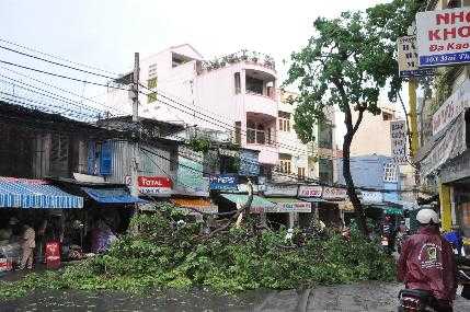 Tại góc ngã tư Mai Thị Lựu - Bùi Hữu Nghĩa (P.Đa Kao, Q.1) một cây xanh bị gió quét mạnh làm tét gãy phần ngọn cây. Nghe tiếng la thất thanh của người dân cùng tiếng gãy đổ ầm ầm của cây, kéo theo dây điện đứt rơi vãi xung quanh khiến những người vừa điều khiển xe và đi bộ qua đây hốt hoảng tháo chạy tán loạn.