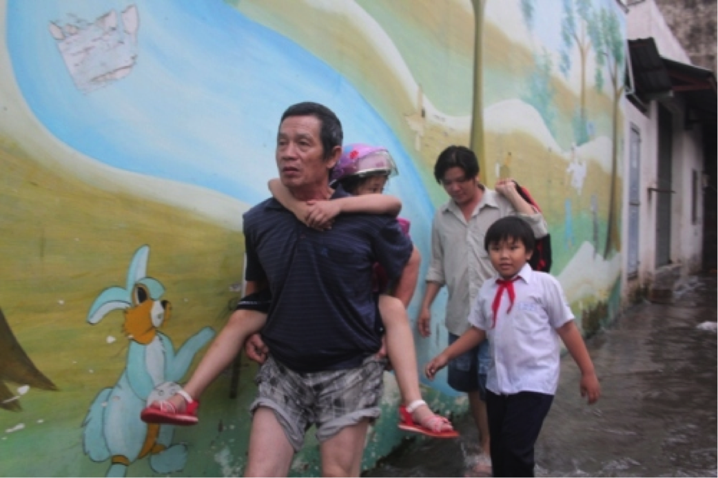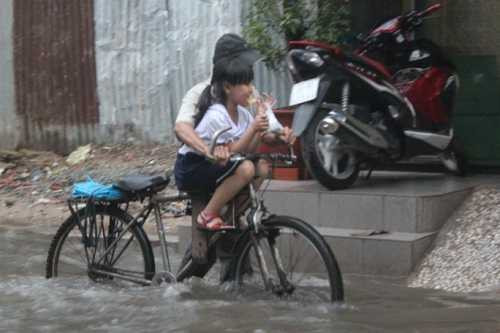 | Em nhỏ này phải xắn quần lên cao để lội nước về nhà |