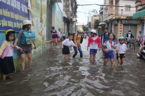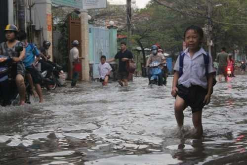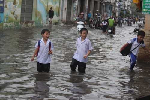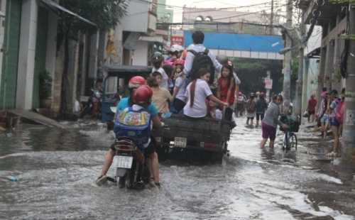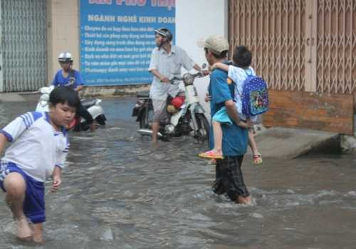 (VTC News) - Đường ngập lênh láng nước, các phương tiện đều khó khăn trong việc đi lại, nhiều phụ huynh ở TP.HCM phải đi bộ cõng con về nhà.