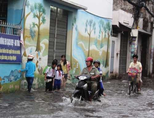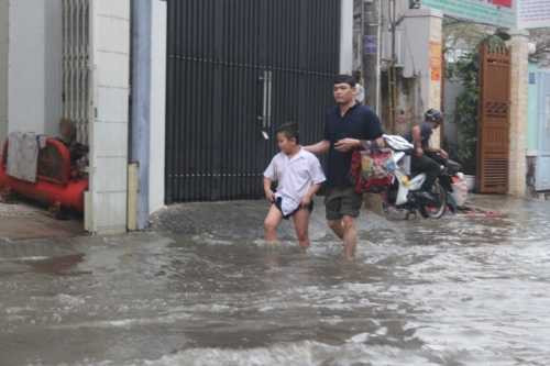 | Cả phụ huynh và học sinh đều bở hơi tai vì ngập nước, xe chết máy |