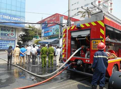 Vụ cháy xảy ra khoảng 12h trưa 12/2, tại Ngân hàng Đầu tư và Phát triển Campuchia (BIDC) chi nhánh TP.HCM (số 110, phường 7, quận 3, TP.HCM).