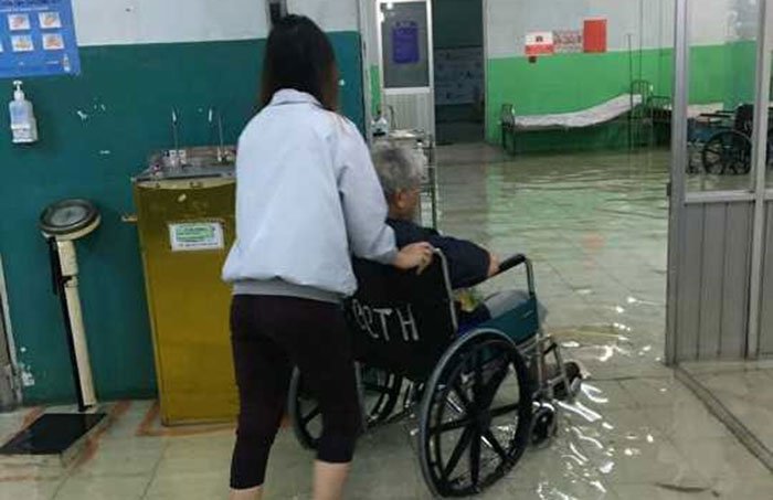 Sáng 26/11, việc cấp cứu và điều trị bệnh nhân tại bệnh viện này gặp trở ngại vì ngập nước. Các nhân viên y tế của bệnh viện phải xắn quần, mang ủng bì bõm trong nước ngập để khám, điều trị, chăm sóc cho bệnh nhân.