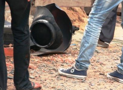 Từ trong khu vực cơ sở môt người đàn ông bị thương nặng được đưa ra ngoài sơ cứu do bị mảnh bình gas loại 12 kg phát nổ văng trúng.