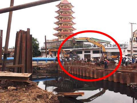 | Xác chết được xe cẩu vớt lên (vòng tròn đỏ). Ảnh: Huy Phan |