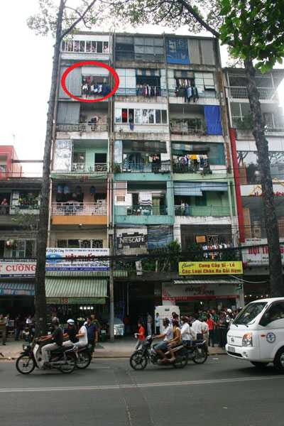 | Khu nhà tập thể nơi cháu Hậu bị rơi (khoanh tròn đỏ) |