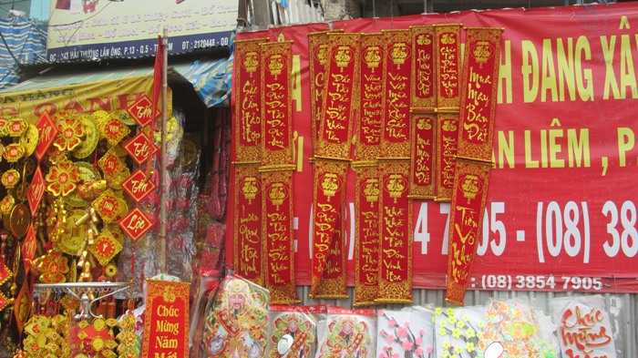 (VTC News) – Tết đang đến rất gần. Con đường Hải Thượng Lãn Ông (Q.5, TP.HCM) rực rỡ sắc đỏ của câu đối, phong bao lì xì, mai đào giả.
