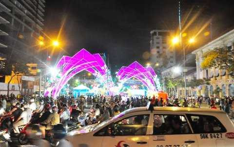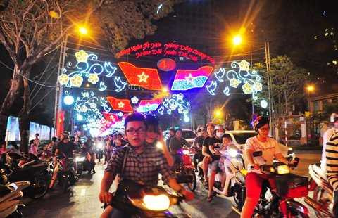 Một số tuyến đường như: Lê Duẩn, Đồng Khởi, Nguyễn Du (quận 1)… rực sáng cờ hoa chào đón năm mới và kỷ niệm 40 năm ngày giải phóng miền Nam, thống nhất đất nước.
