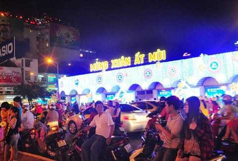 Theo ghi nhận của phóng viên VTC News, khoảng 21h đêm 18/2 (30 Tết), đông đảo người Sài Gòn đã đổ xuống đường đi chơi Tết. Khắp phố phường đèn hoa được treo lên chờ thời khắc giao thừa sắp đến.  |