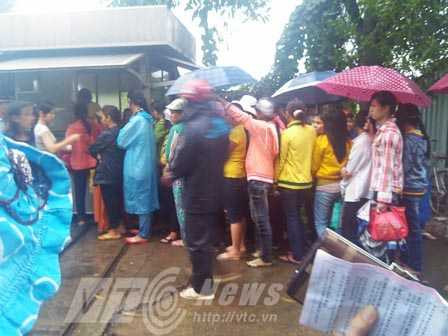 | Công nhân đội mưa để làm giấy tờ bảo hiểm thất nghiệp tại Công ty Pou Yuen (Q.Bình Tân). Ảnh: Phan Cường |