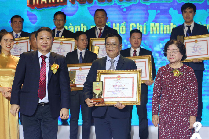 Bà Trương Mỹ Hoa, nguyên Phó Chủ tịch nước và ông Dương Anh Đức, Phó Chủ tịch UBND TP HCM trao bằng chứng nhận và kỷ niệm chương cho doanh nghiệp đạt danh hiệu. (Ảnh: NLĐ)