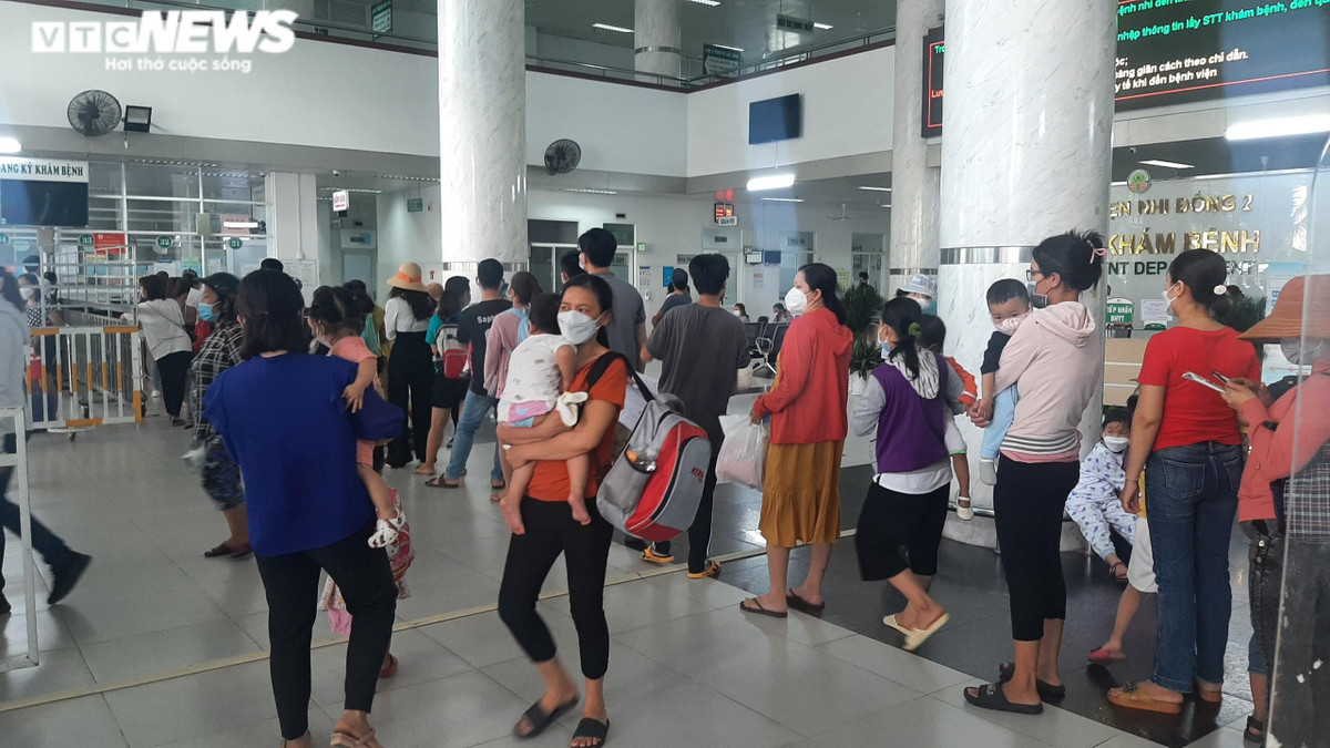 Phía trước khoa Khám bệnh Bệnh viện Nhi đồng 2, khu vực khai báo y tế, xét nghiệm nhanh COVID-19 đến khu vực xử lý trẻ mắc COVID-19 có rất đông người chờ khám.