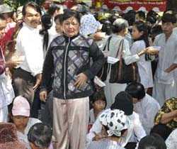 Lợi dụng lúc đông người chen lấn, xô đẩy kẻ gian nhanh chóng ra tay móc túi. Hình chụp tại chùa Hoằng Pháp, nhiều người đang tranh thủ lấy phần ăn vào buổi ăn trưa ngày 11/12/2011