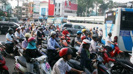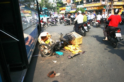 Khi đến vòng xoay Ngã Bảy thì bất ngờ ông Đinh Trung Sơn (51 tuổi) điều khiển xe máy BKS 51M1-9737 chở đầy bánh mì lưu thông ngược chiều trên đường Điện Biên Phủ tới vòng xoay đã mất lái đâm mạnh vào hông xe buýt.