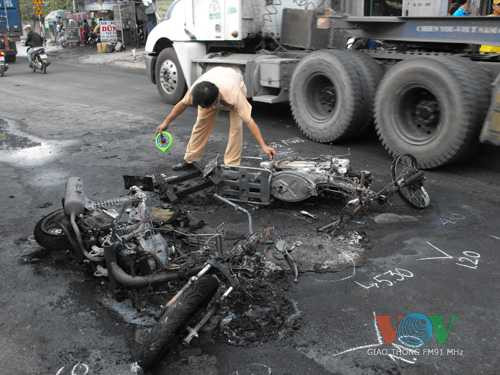 Tại hiện trường, hai xe máy bị thiêu rụi chỉ còn trơ khung sắt, nhiều vết dầu bị đổ tràn ra đường. Đám cháy còn làm 1 cột điện chiếu sáng công cộng gần đó bị cháy đen và một phần mái hiên nhà dân bị hư hỏng.