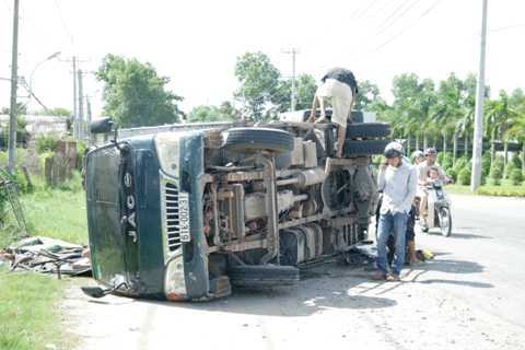 Ghi nhận tại hiện trường, nhiều bao thức ăn gia súc tràn ra đường, chiếc xe bị lật ngang giữa đường, đầu và thùng xe bị hư hỏng nặng, cầu sau của bánh xe bị gãy rời. Trên mặt đường có vết cày sâu dài hơn 10 mét.