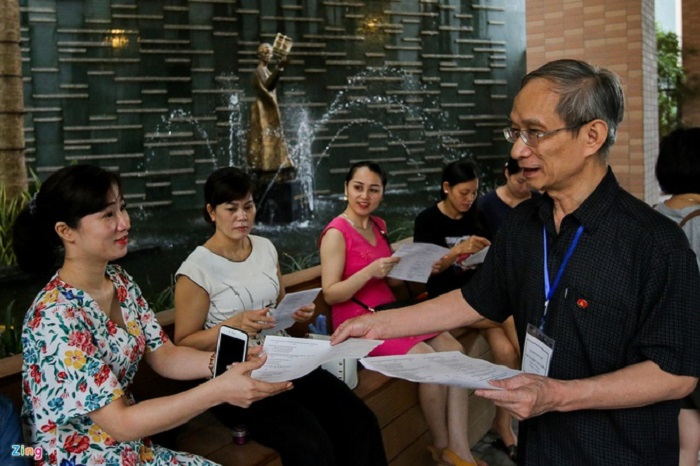 Thầy Nguyễn Xuân Khang và phụ huynh trường Marie Curie, Hà Nội. (Ảnh: Việt Linh)