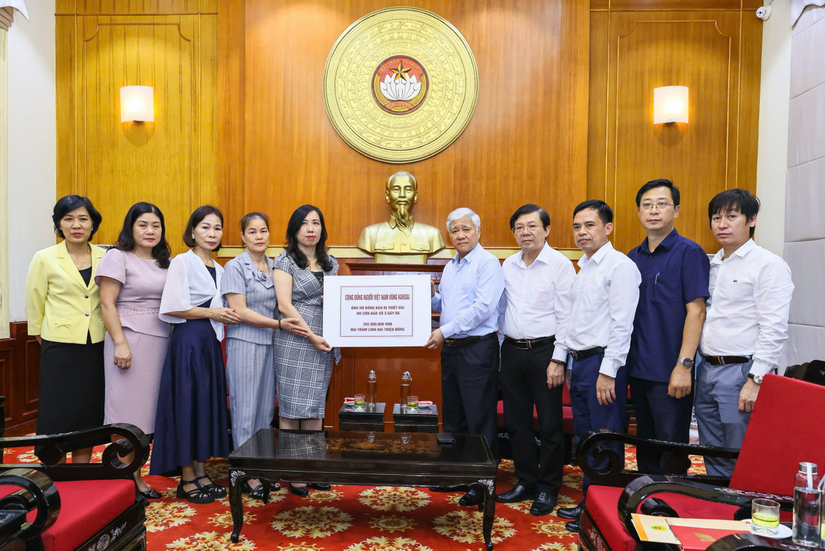 Chủ tịch Ủy ban Trung ương Mặt trận Tổ quốc Việt Nam Đỗ Văn Chiến tiếp nhận ủng hộ từ Cộng đồng người Việt Nam vùng Kansai. (Ảnh: mattran.org.vn)