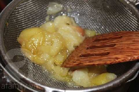 | Khi miếng đào đã mềm, vớt các miếng đào nghiền mịn trên rây để loại bỏ bã. Như vậy ta đã được phần siro đào. |