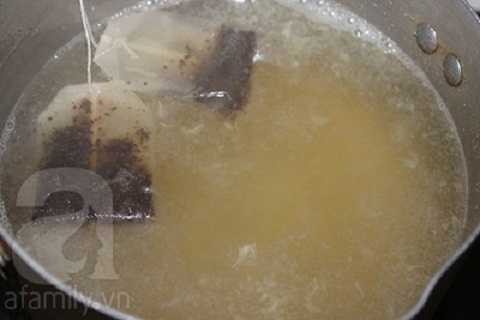 | Thêm 400ml nước vào phần siro đào, đun sôi, tắt bếp, nhúng 2 gói trà vào. |
