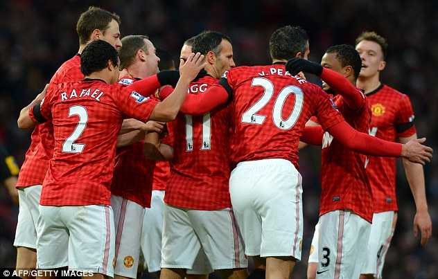 Giữ thế trận áp đảo ở nửa đầu hiệp 1, phút 13, sau pha dàn xếp từ phía bên cánh phải MU, Van Persie có pha di chuyển tì đè rồi chuyền bóng dọn cỗ cho Ryan Giggs mở tỉ số trận đấu. Bàn thắng đánh dấu kỉ lục 21 năm liên tiếp ghi bàn ở giải Ngoại Hạng Anh của tiền vệ xứ Wales.