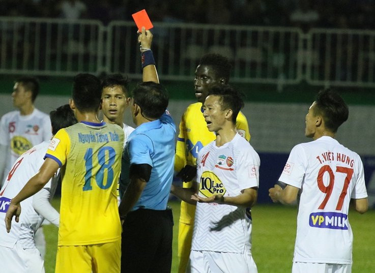 Trọng tài Trần Xuân Nguyện gây nhiều tranh cãi trong trận HAGL 2-3 FLC Thanh Hóa.