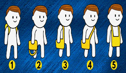 Với bài trắc nghiệm vui này, bạn hãy nhìn vào bức ảnh và cho biết mình thích đeo cặp/túi theo cách nào trong 5 cách dưới đây, sau đó tra kết quả dự đoán tính cách bên dưới nhé.