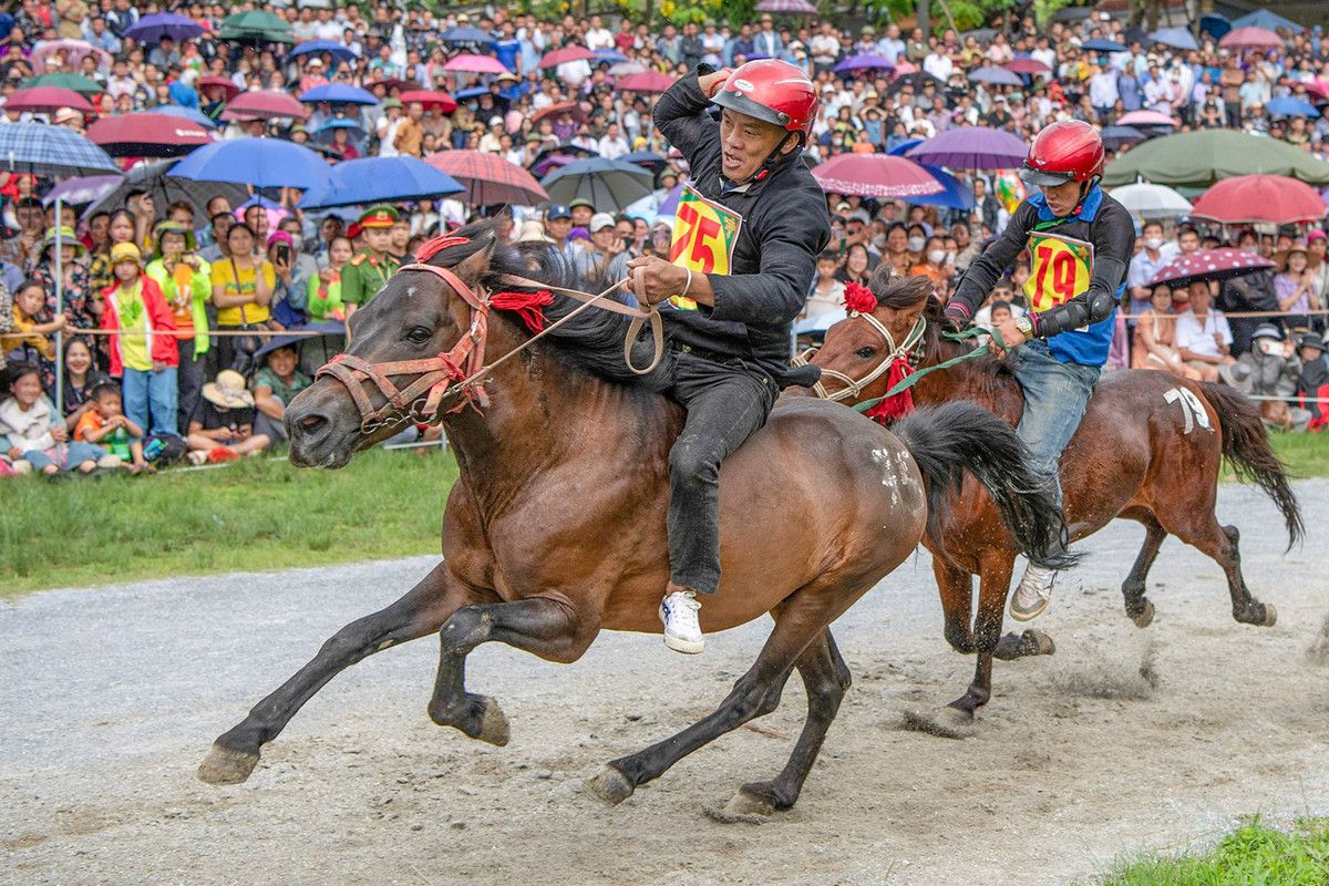 Những chàng trai người dân tộc thiểu số đầu đội mũ bảo hiểm, chân đi giày ba-ta trên lưng ngựa phi như bay trên đường đua, cống hiến cho người xem những màn rượt đuổi nảy lửa với những pha bứt tốc xuất sắc.
