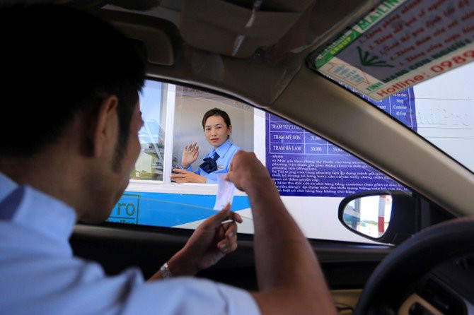 Nhân viên trạm thu phí kiểm tra thẻ vào đường cao tốc để thông báo giá cước.