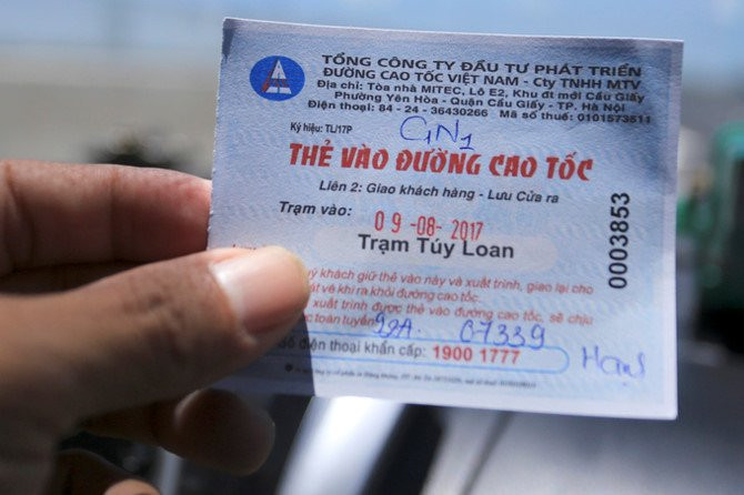 Đi từ Đà Nẵng, khi đến trạm thu phí Túy Loan, chủ phương tiện sẽ được phát một thẻ vào cao tốc, biển số xe được ghi tay và nộp phí theo từng chặng.