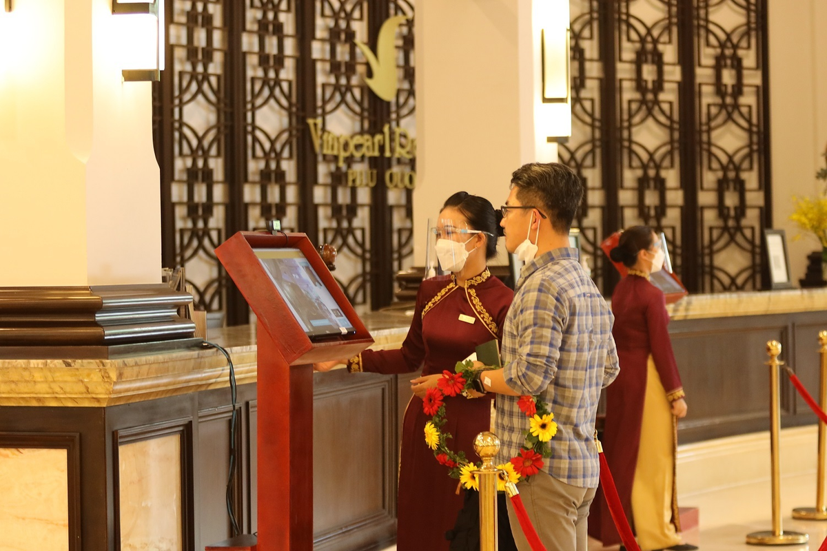 Đông đảo du khách khá thích thú với thủ tục check-in, chụp hình nhận diện gương mặt ứng dụng công nghệ trí tuệ nhân tạo AI giúp thuận tiện khi di chuyển và sử dụng các tiện ích khác trong siêu quần thể như ẩm thực, vui chơi giải trí.