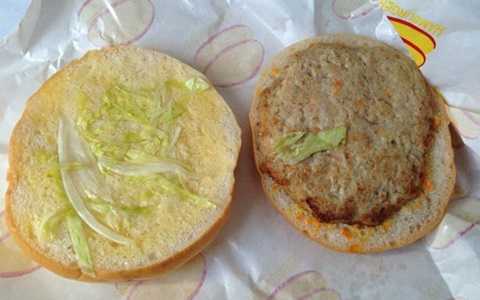 Không ai biết đến đây là miếng thịt gì. Một hình ảnh cho thấy, chiếc bánh rất đơn giản, 2 miếng bánh mì với miếng thịt và chút rau cải thảo ở giữa.