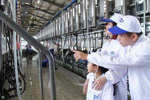 Tới giờ vắt sữa bò, các gia đình được mời vào khu vực theo dõi đặc biệt vì quy trình vắt sữa được thực hiện tự động và hoàn toàn khép kín. Nhìn dây chuyền máy lấy sữa hiện đại đưa những dòng sữa tinh khiết đi theo những đường ống lạnh chạy vào các thùng chứa, các gia đình đều ồ lên thích thú.