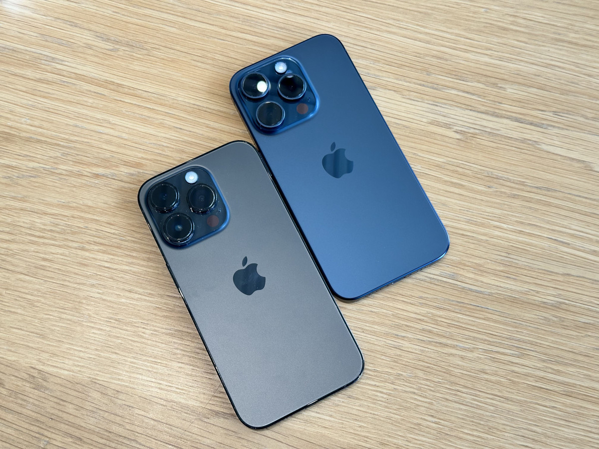 So sánh iPhone 14 Pro (màu xám than chì) và iPhone 15 Pro (Titan Blue) không có sự khác biệt về kích thước hay thiết kế, nhưng khi cầm trên tay người dùng có thể dễ dàng phân biệt nhờ trọng lượng của máy.