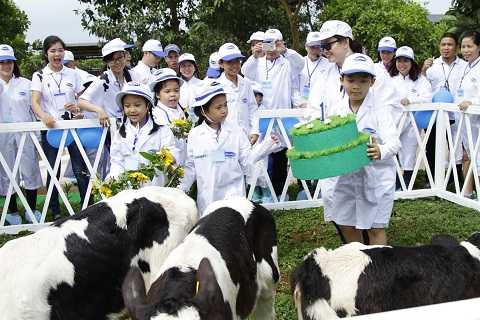 Các bạn nhỏ thì vô cùng phấn khích khi được các cô chú kỹ thuật viên cho sang thăm khu vực chuồng bê, được tận tay vuốt ve và cho những bạn bê uống sữa, ăn khẩu phần đặc biệt.