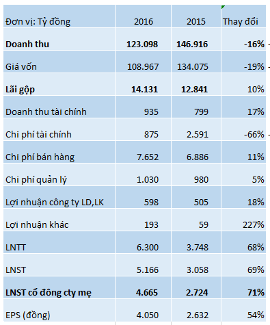 Tuy nhiên, nhân tố tác động mạnh nhất đến lợi nhuận năm 2016 không nằm ở hoạt động kinh doanh chính mà là do yếu tố tài chính. Đáng kể nhất nhất là chi tài chính giảm 2/3 so với năm trước, tương ứng giảm 1.700 tỷ, chủ yếu là do giảm lỗ tỷ giá. Trong khi đó, doanh thu tài chính tăng 17% so với cùng kỳ.