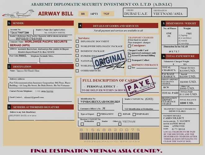 ![]() Vận đơn hàng không mà Thúy nhận được, trong đó có ghi giá trị lô quà tặng 11.000 USD. Ảnh: NVCC. |