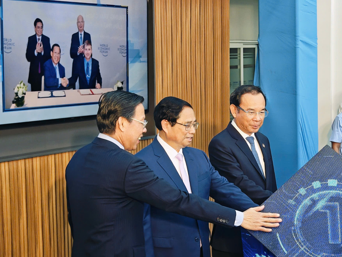 Thủ tướng Phạm Minh Chính cùng Bí thư Thành ủy Nguyễn Văn Nên, Chủ tịch UBND TP.HCM Phan Văn Mãi thực hiện nghi thức khánh thành Trung tâm Cách mạng Công nghiệp lần thứ 4 tại TP.HCM ngày 25/9/2024. (Ảnh: C4IR)