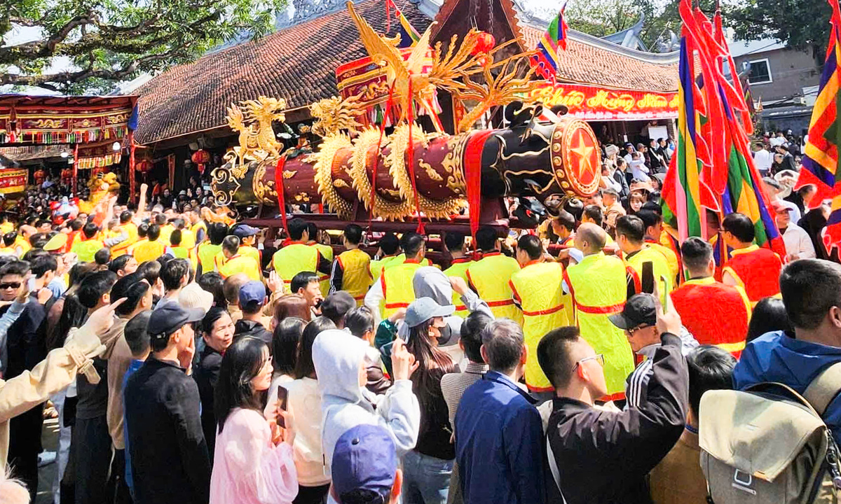 Khoảng gần trưa, hai “ông pháo” được rước về đến sân đình Đồng Kỵ trong sự chứng kiến của hàng nghìn người dân và du khách thập phương. Pháo được an vị tại vị trí trung tâm để chuẩn bị cho các nghi thức truyền thống tiếp theo.