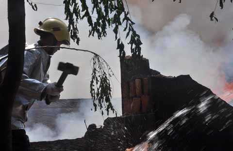 | Các chiến sĩ phá tường để phun nước vào bên trong. |
