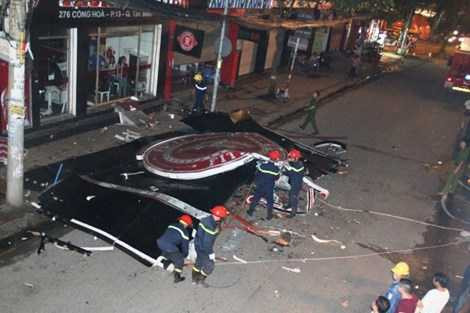 Trong đó, tại 276 Cộng Hòa, địa chỉ của Câu lạc bộ thể hình, một bảng hiệu loại lớn bị quật ngã, nằm đè lên bó dây cáp viễn thông, dây điện rồi treo lơ lửng ở độ cao gần 20 m. Nhiều người dân gần đó hoảng hốt bỏ chạy, điện khu vực bị cắt.