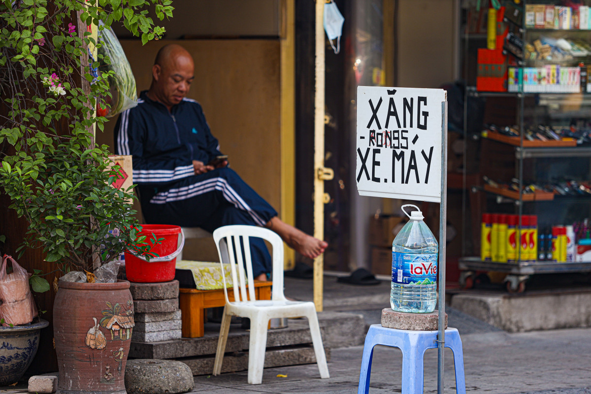 Không khó để bắt gặp những điểm bán xăng lẻ tự phát trên vỉa hè vào những ngày này ở Hà Nội.